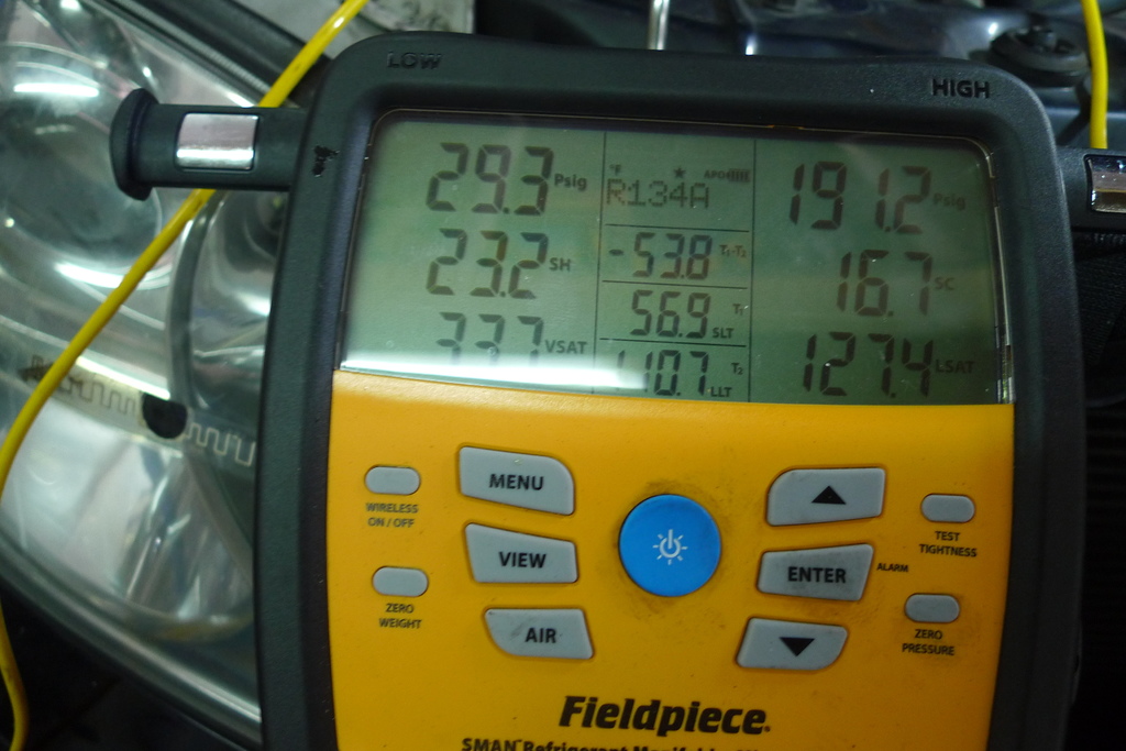 TOYOTA CAMRY 冷氣不冷.數位冷媒錶接上.冷媒不足.冷氣健診專用儀器測快速10分鐘抓漏完成.風箱仁蒸發器漏冷媒.拆裝儀表檢修流程冷氣保養 管路清洗.更換壓縮機潤滑油.冷媒及冷凍油定量充填.冷房效率一級棒8.6度c 毅修汽車專業冷氣
